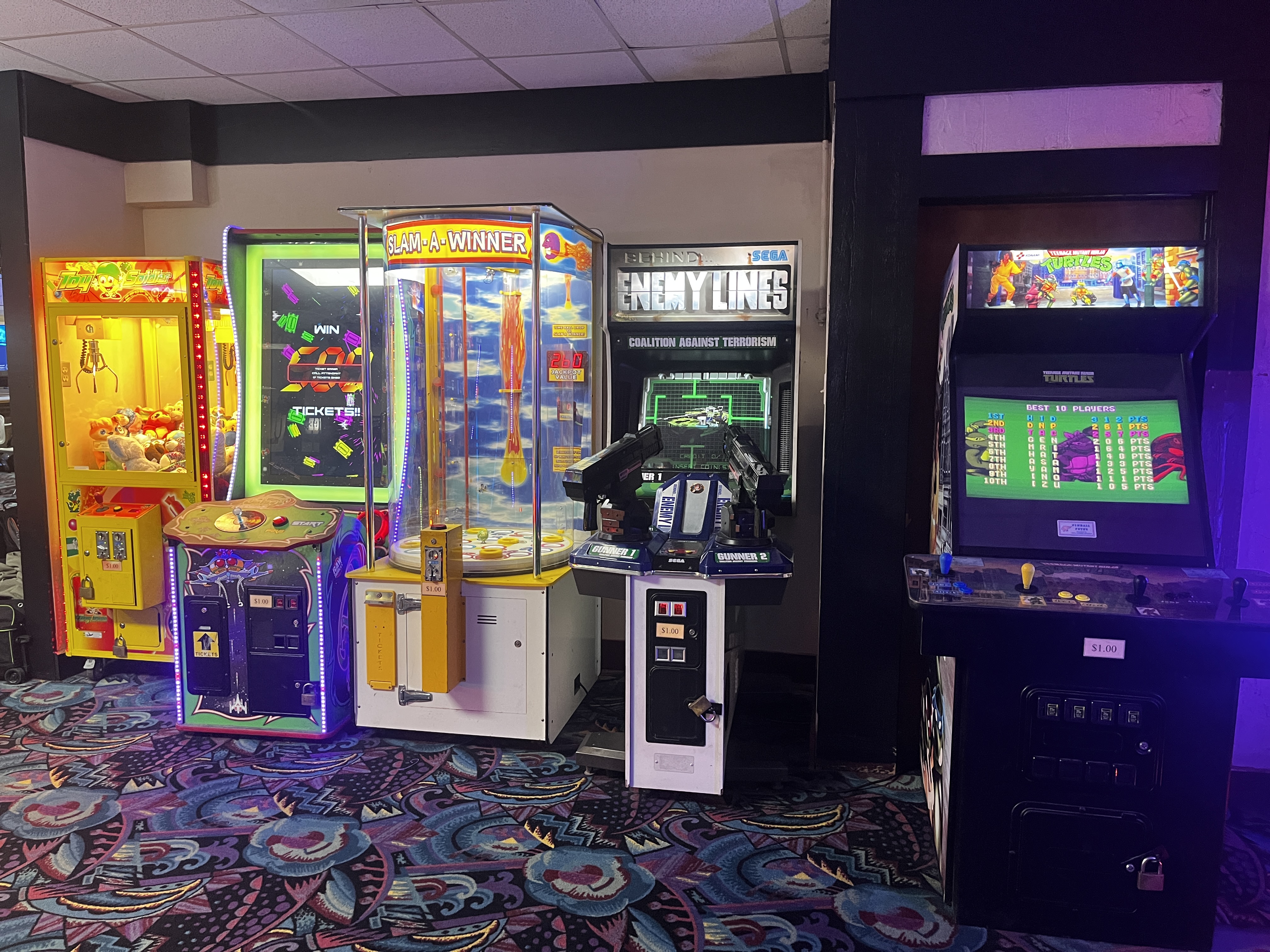 | Picture Description | Shows games “Toy Soldier” claw machine, “Galaga Assault”, “Slam-A-Winner”, “Behind Enemy Lines”, and “Teenage Mutant Ninja Turtles”. |