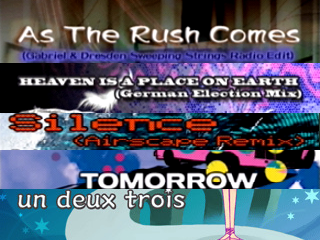 Comments | This trance-inspired mix of stages featured in Extreme 2 and DDR STR!KE has been mixed together to flow at a continous, smooth 140 bpm; though one small, obvious part of the stage plays at half-speed. Features: As The Rush Comes, Silence (Airscape Remix), HEAVEN IS A PLACE ON EARTH, TOMORROW, un deux trois. |